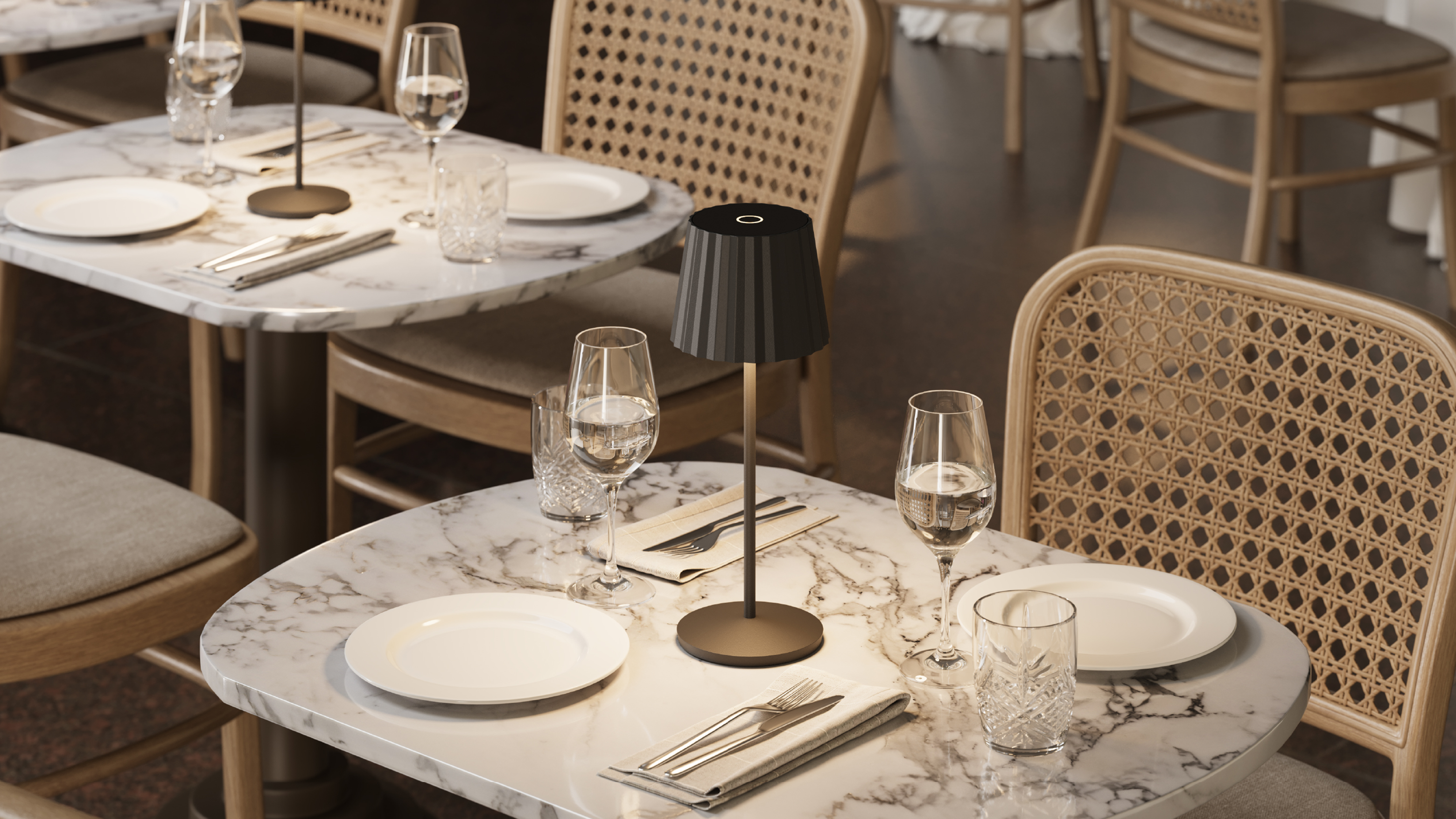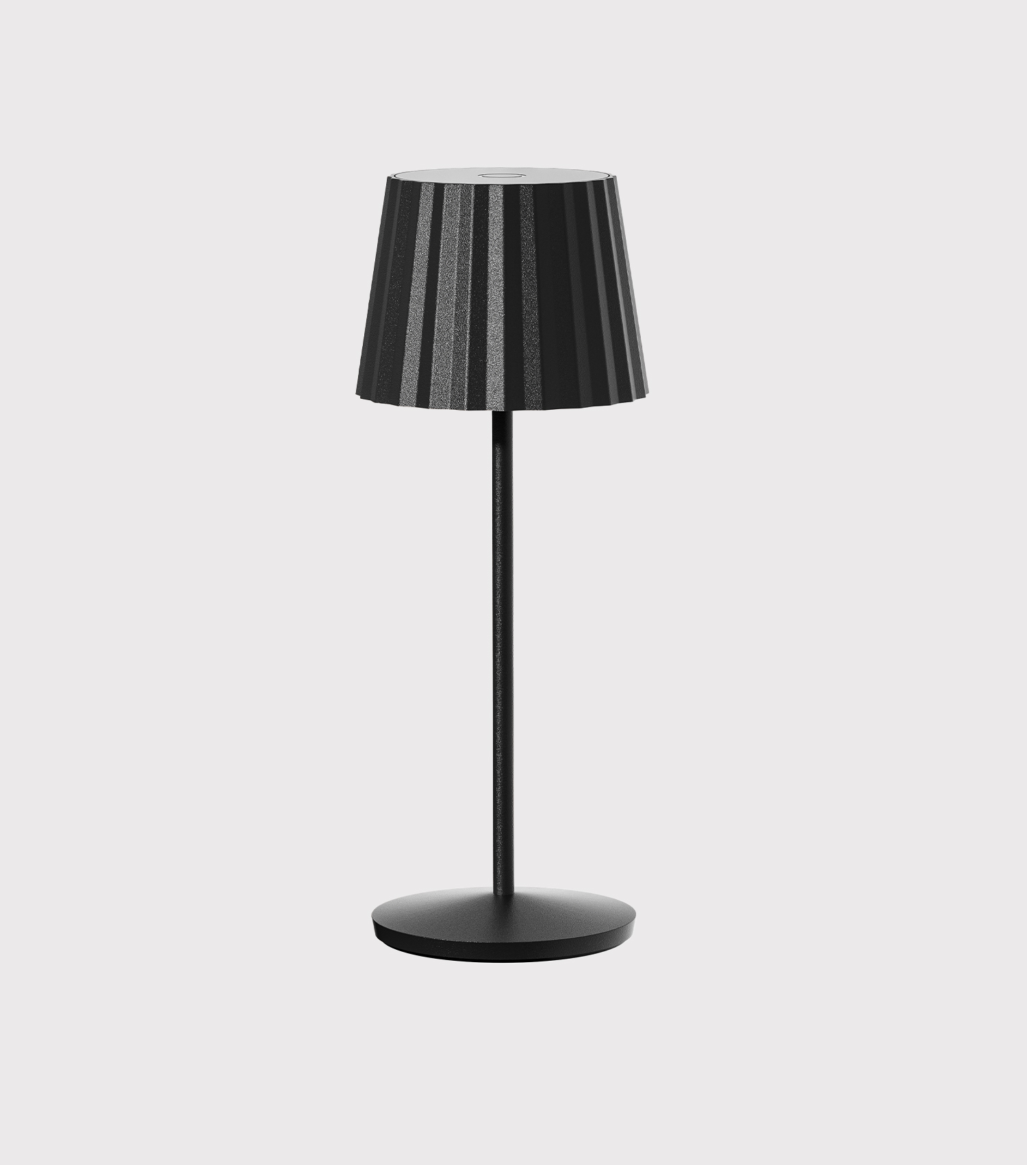 Rechargeable table lamp with a contact charging base. Cordless table lamp providing direct downward and glare-free light. IP65 protection, making it ideal for indoor and outdoor use. Head, rod and base made in corrosion resistant and painted aluminium alloy. Protection with polyester powder coating. Diffuser made in polycarbonate.